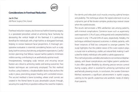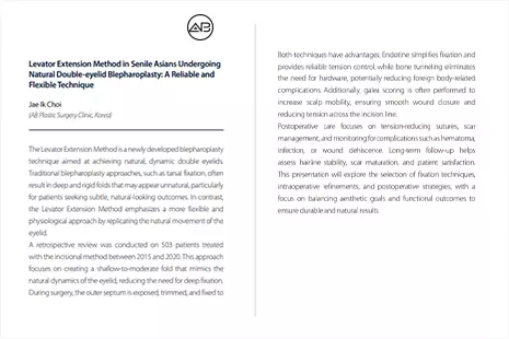 AB整形外科将继续立足亚洲人面部解剖特点,通过持续研究与技术优化推动手术创新。基于在PRS KOREA 2024分享的学术成果——从先进的额部缩小术到针对亚洲中年患者优化的上睑成形术——本院将持续致力于研发能够实现自然、协调、年轻化效果的面部提升与眼整形技术。