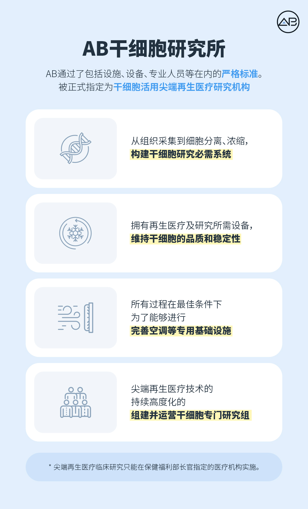 经过多年潜心研究与丰富临床积累,AB整形外科&干细胞中心正式获得韩国保健福祉部指定,成为官方认证的“先进再生医学机构”。