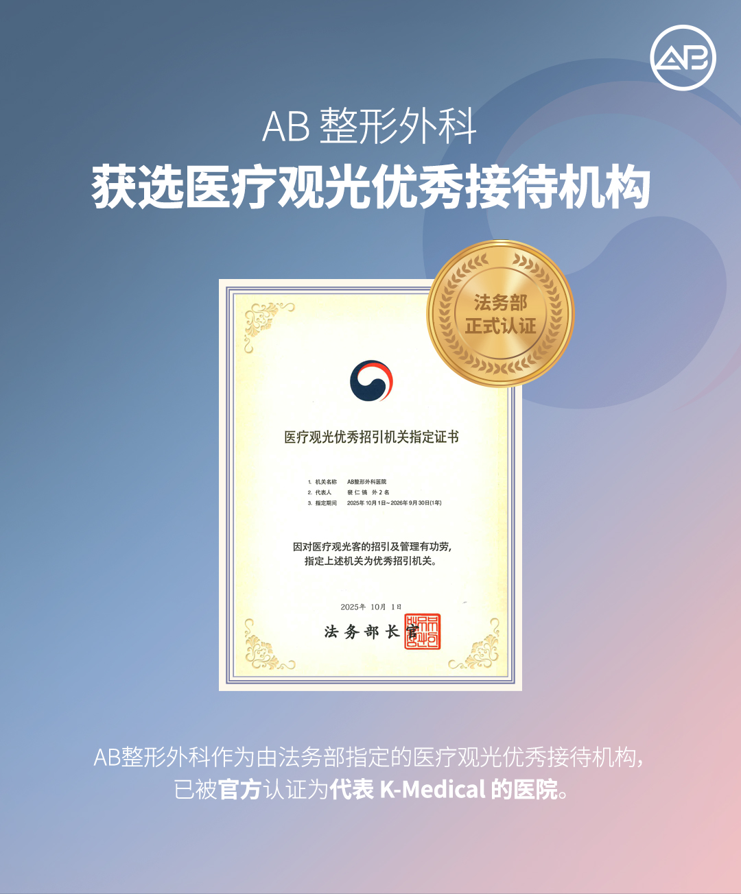 AB整形外科正式被法务部指定为 「2025-2026年度优秀医疗观光邀请机构」。