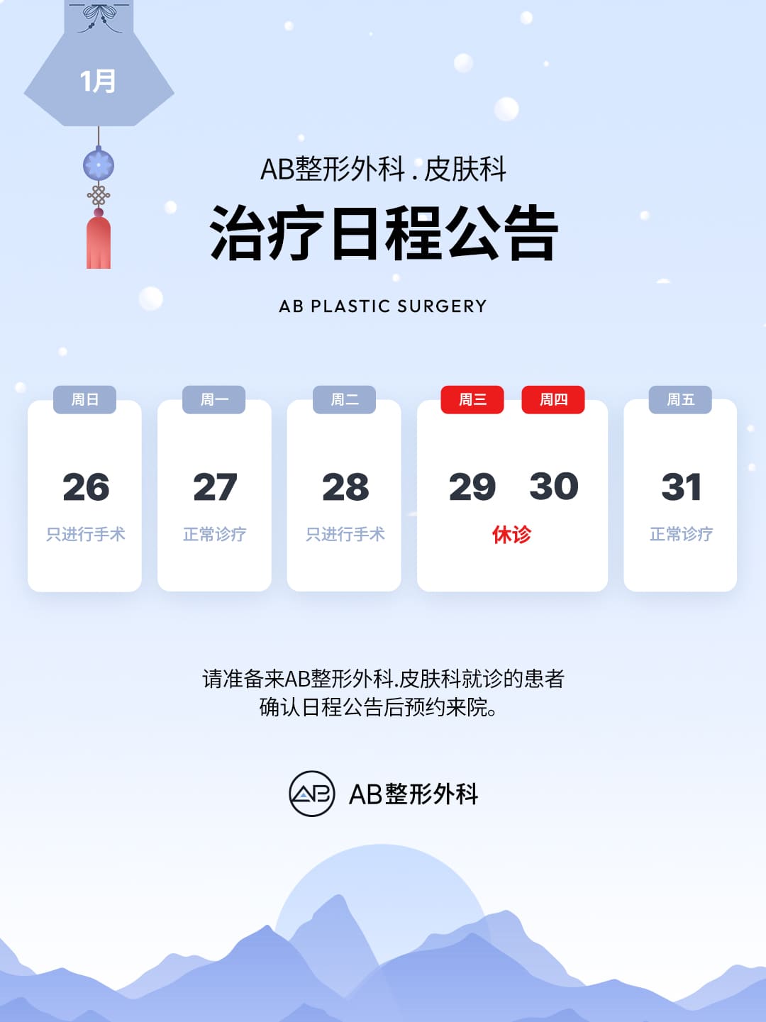 【AB皮肤科】 1月治疗日程公告