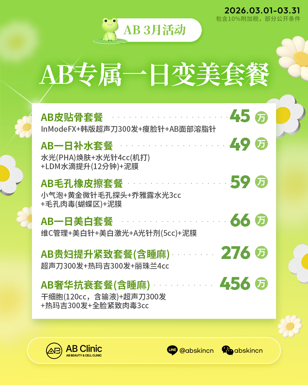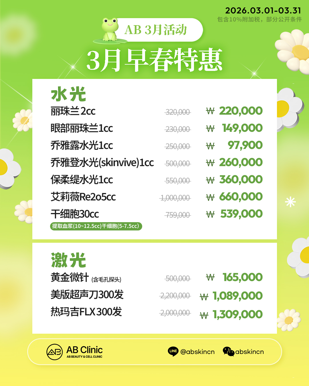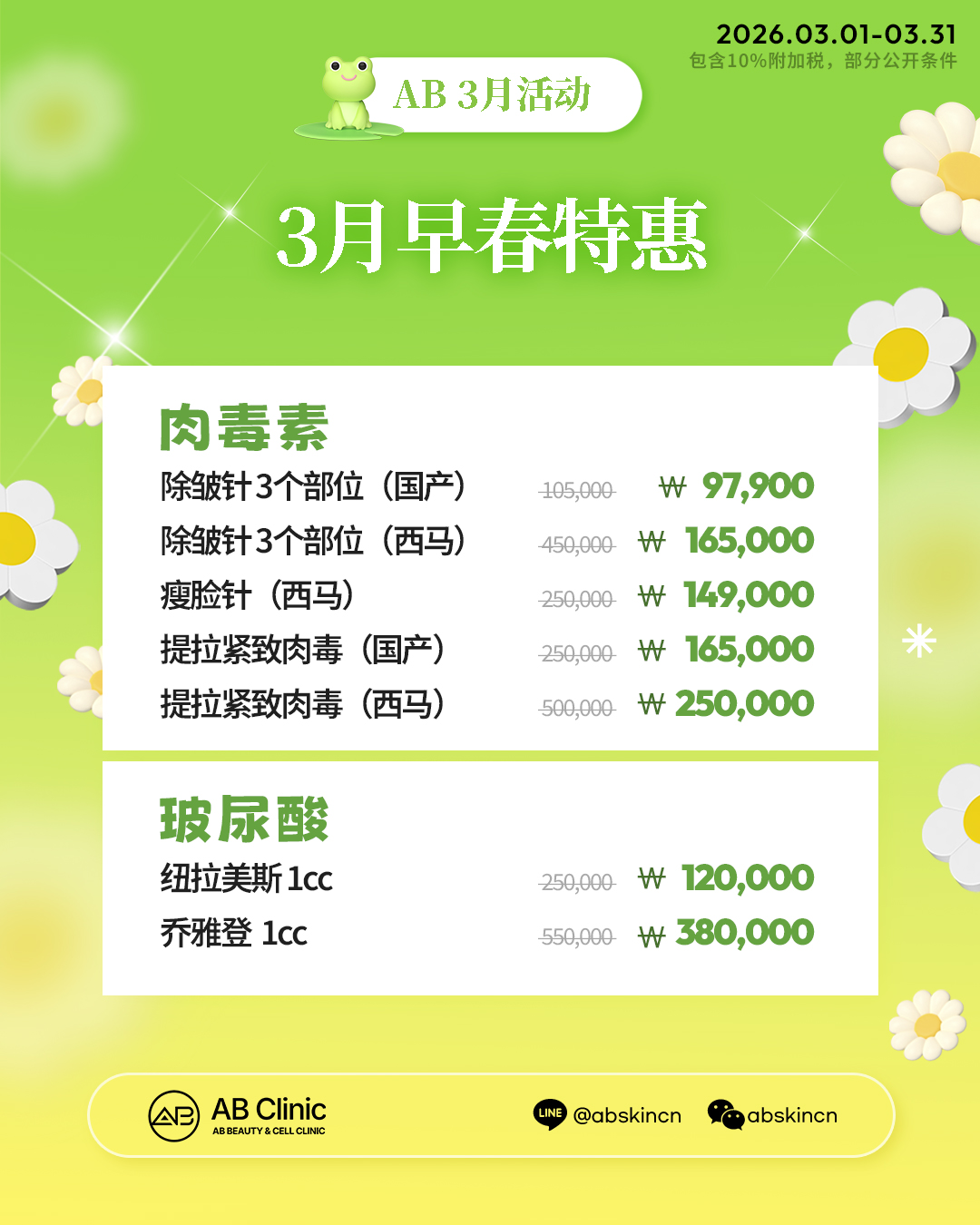 #女神节限定 #三月焕肤计划 #韩国整形 #韩国皮肤科 #首尔医美 #水光针 #肉毒杆菌 #玻尿酸填充 #超声刀 #热玛吉 #干细胞疗程 #春季保养 #ABClinic
