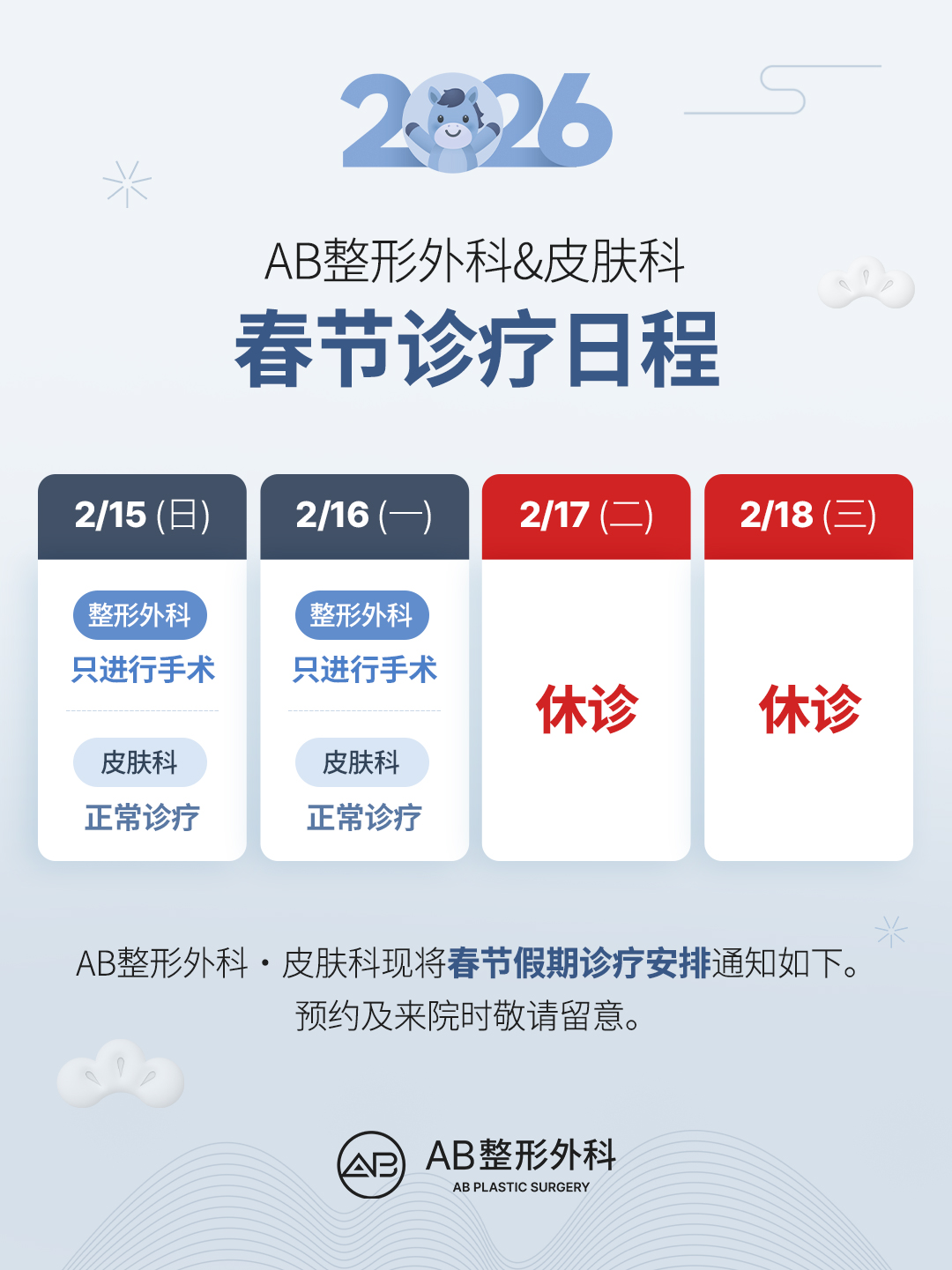 2026年春节即将到来,AB整形外科&皮肤科已公布节日期间诊疗安排,方便您提前规划美丽行程。