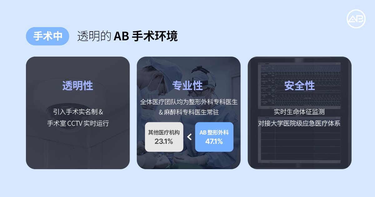 AB 整形外科将术前诊断、手术执行、术后恢复管理整合于同一安全系统中,持续专注于降低整形副作用发生概率。