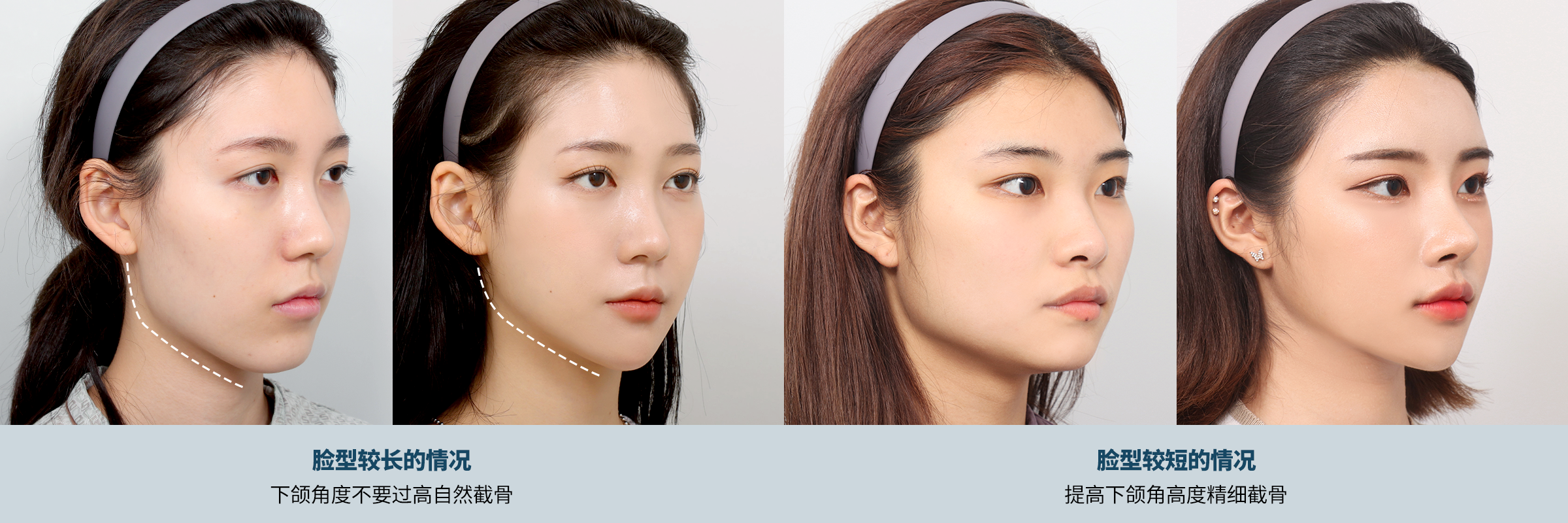下颌角手术针对短脸型和长脸型,需根据各自特点进行手术。 短脸型可能下颌线相对较短且显得较宽。 这种情况下,通过提高下颌线角度,进行切除,使面部更加纤长。 通过这种方法,面部纵向长度在视觉上看起来可以拉长,给人以均衡的印象。 长脸型具有面部纵向长度显长的特点。 此时请自然切除颌线角度,防止过度抬高,适当调整面部长度。 通过这种方法,在视觉上缩短脸部的纵向长度,打造更加和谐的脸型。 此外,皮质骨较厚时,可结合皮质骨切除,进一步增强正面效果。