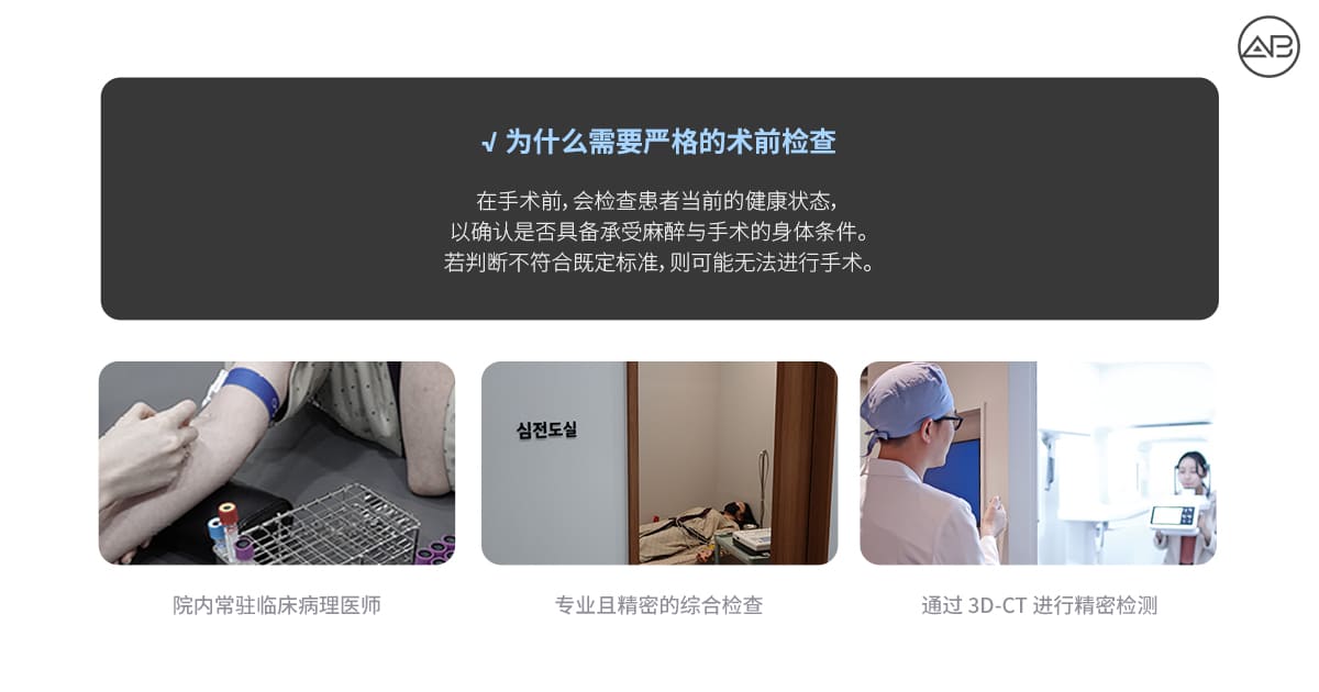 所有检查均不外包给第三方机构,而是在 AB整形外科院内设置的 X 光室、心电图检查室等专属检查空间内独立完成,同时确保检查流程的准确性与安全性。