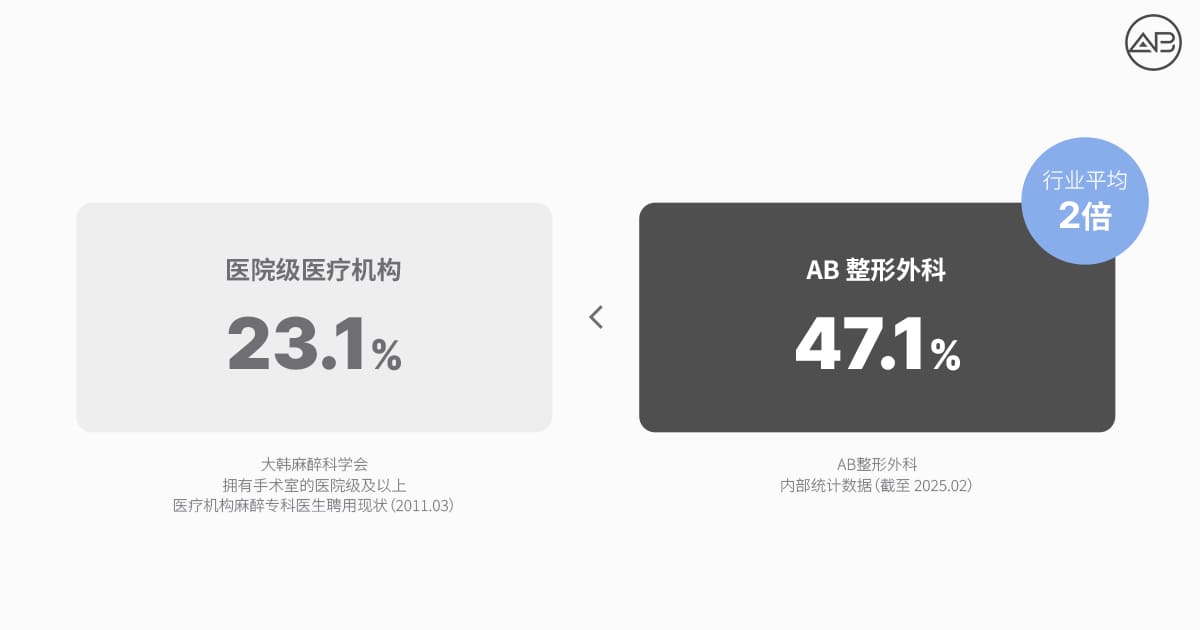 AB整形外科的麻醉科专科医生常驻率达 47.1%,约为医院级医疗机构平均水平的 2 倍,构建了高度完善的麻醉安全体系。