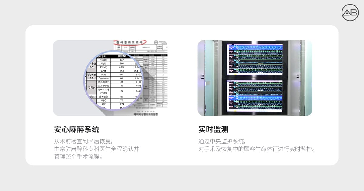 通过麻醉科医生 1 对 1 全程密切管理 与多层级应急应对系统,AB整形外科实现了从术前、术中到术后的无间断安全管理。
