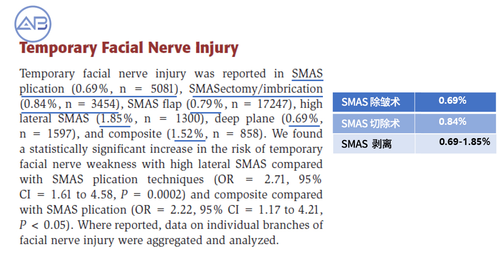 SMAS剥离术为0.69%至1.85%。永久性神经损伤非常罕见,