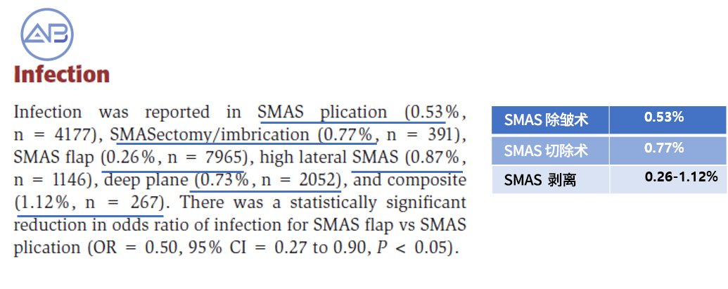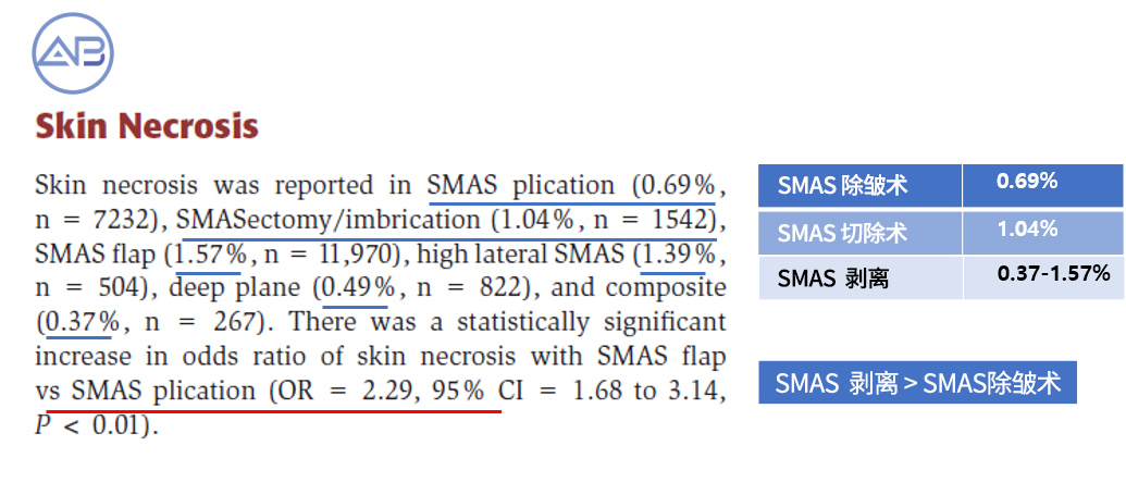 2.血肿:术后肿血的生率为SMAS除皱术0.7%,SMAS切除术1.9%,SMAS剥离术0.85%。这里有趣的是通过优势比(odds ratio)。
