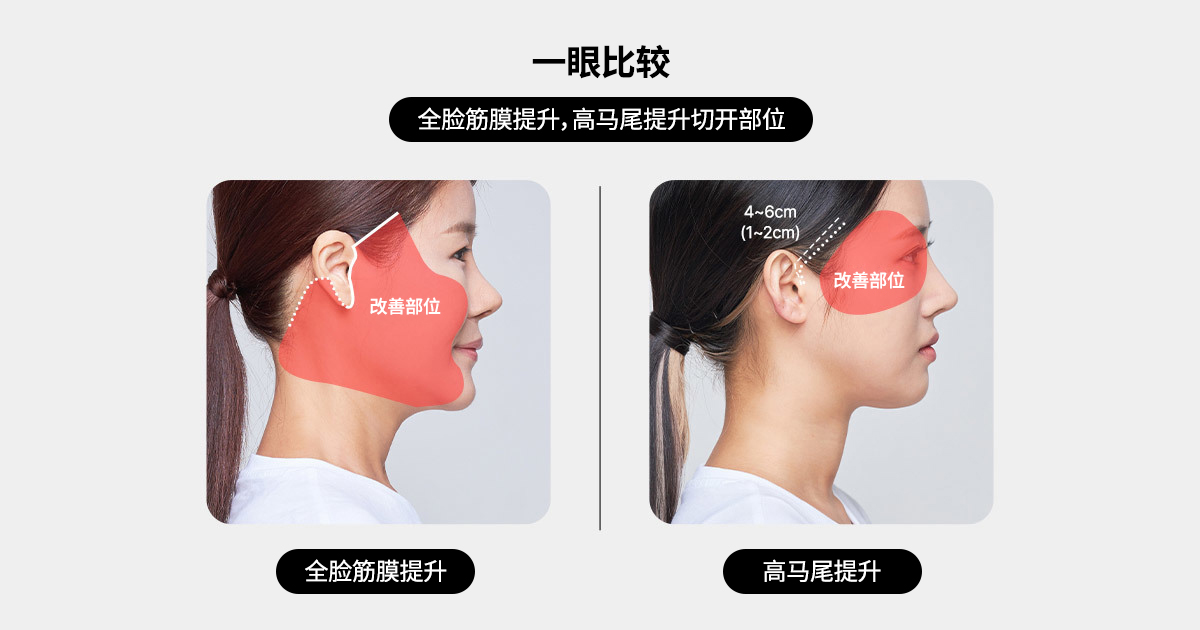 “高马尾提升”和“全脸提升”的区别主要在于切口位置、长度以及改善范围。