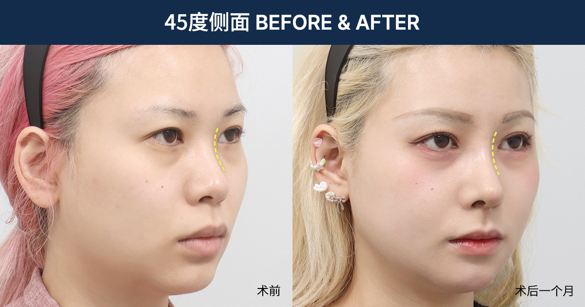 第1个月:软组织肿胀逐步消退,鼻梁变直、鼻尖轮廓清晰;整体面部线条更和谐、干练。