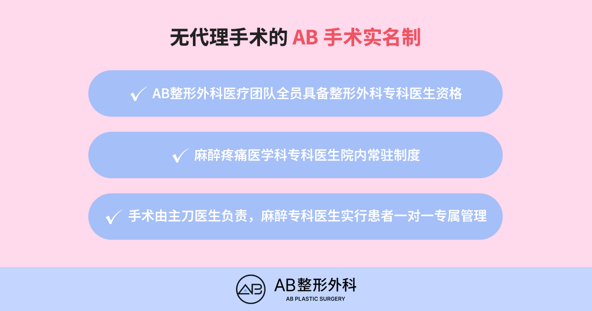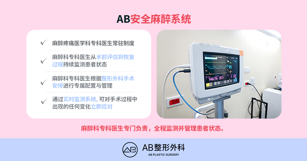 而 AB整形外科 采用 麻醉科专科医生常驻系统,