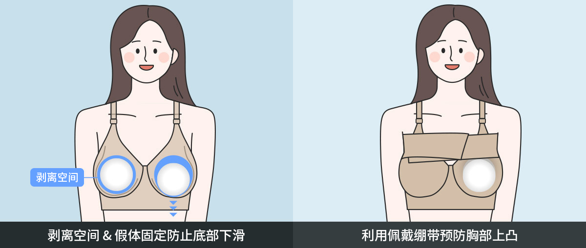 除胸部手术外,所有整形手术后均需遵守医院、专门医指导的整形术后管理方法。为植入假体,确定乳房内剥离空间和假体的位置,塑形内衣需要穿3个月左右。因个人乳房特性与丰胸时使用的假体种类与特性、各手术主刀医生的手术方法不同,故而塑形内衣的佩戴方法也会有所不同。胸部整形后,对于需要预防上凸现象的情况,有时需要在一定时间内同时佩戴上部绷带,相反,也有无需佩戴上部绷带的情况。另外,虽然有可以穿2个月塑形内衣的情况,但假体底部下滑等必须预防位置变形的情况,也有必须穿3个月的案例。为了美丽自然的胸部形状,一定要遵守被告知的塑形内衣穿法和穿戴期间。