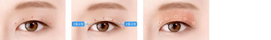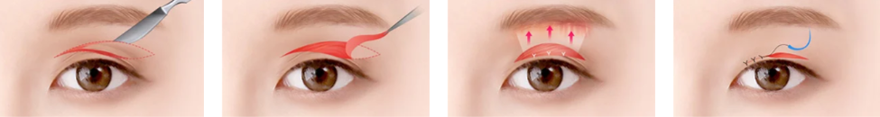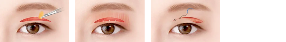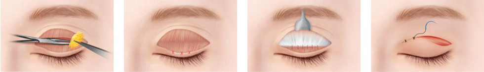 双眼皮线条切开 → 下垂的皮肤,脂肪,肌肉去除 → 隔膜固定 → 缝合