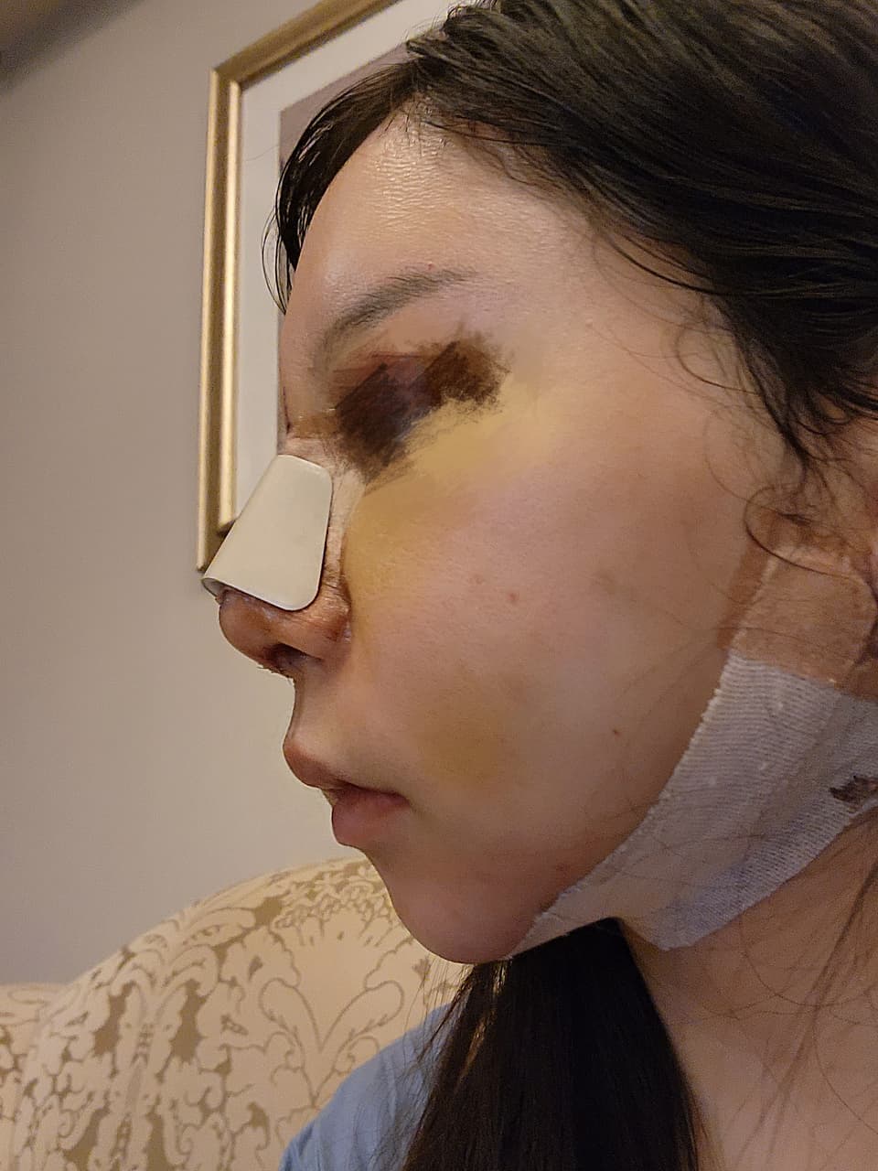 這天化妝出門, 臉上瘀青大部份都蓋掉了 但鼻樑不敢壓粉,很明顯看出來瘀斑 雖然臉會腫但我覺得算是自然的,不會嚇到人的程度~ 第14天要拆線 肋骨還有鼻子內部的線要拆除! 到那個時候應該會更自然一些吧 目前有約了台灣整形外科醫院拆線(也歡迎大家推薦拆線的醫院給我) 到時候再分享記錄心得~~ -------先解答一些可能出現的問題----- 為什麼不在台灣找原本的醫師做? 韋醫師的手術檔期太滿,而且重修費用比較高要36萬, 這次的手術費用多少? 5個項目總共消費了1500萬韓元(約34萬),後來去機場退稅了大約2萬4台幣(每個人條件不一樣可能金額也不一樣的,大家可以去諮詢問一下) 什麼醫院什麼醫師? 英文字母 A*整形醫院,鼻子是 李政*院長 眼睛臉頰下巴是 宋泉*院長
